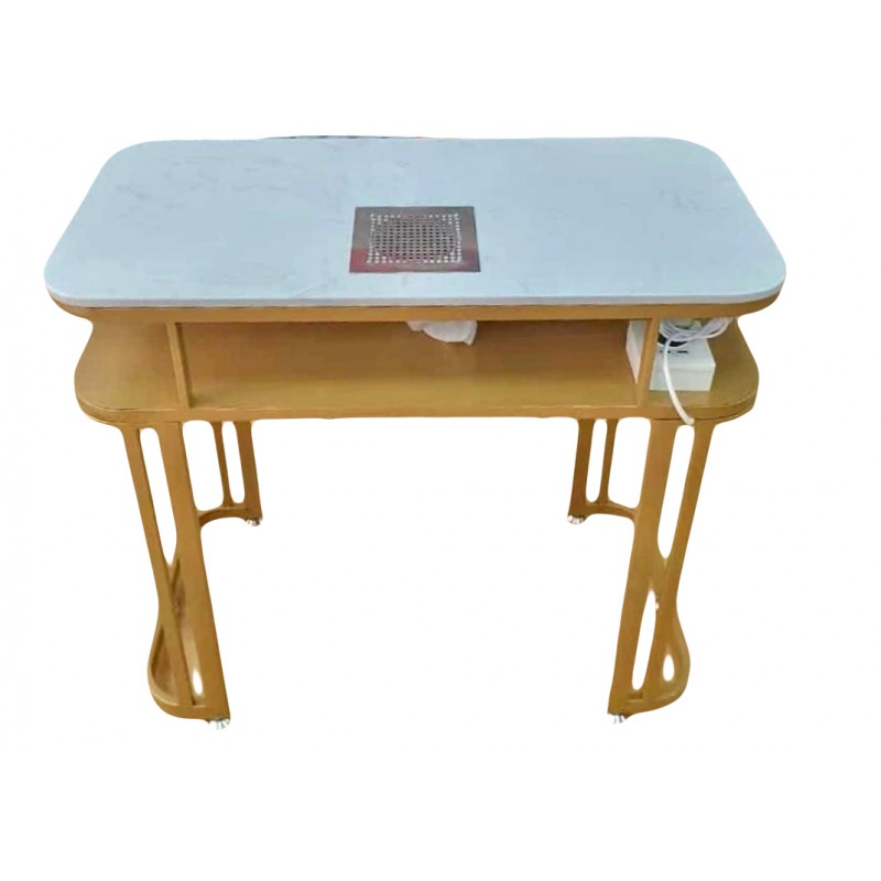 Mesa vintage de metal elegante , práctica y muy resistente con base de porcelánico y estructura de metal en color dorado mate, incluye doble aspirador potente y silencioso para facilitar el trabajo de manicuristas , amplitud suficiente para dos puestos de manicura.