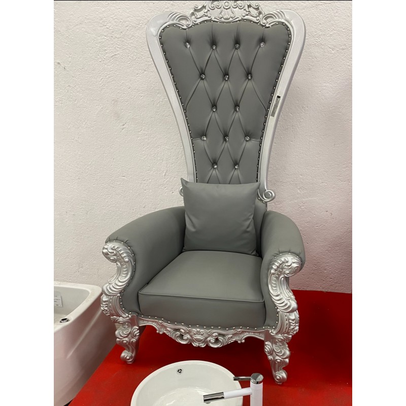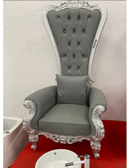 Elegante y espectacular sofá para salones de belleza, fabricado en polipiel gris con molduras y terminación gris plateado.